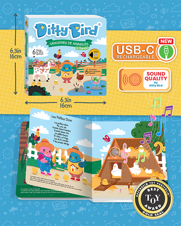 Bring the zoo to your home with Ditty Bird's Canciones de Animales en Español Sound Book! With its lively songs like "Los Pollitos dicen" and "Un Elefante se balanceaba," this book provides a fun and educational opportunity for children to learn about animals and Spanish language through music and interactive play.