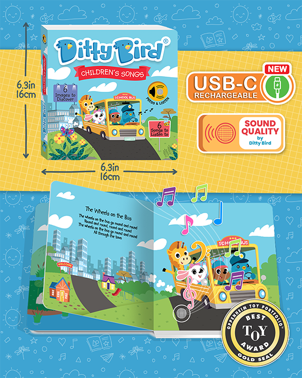 “We love Ditty Bird Books. My son - 1.5 knows how to turn them on and off on his own. He can get an hour (if not more) of entertainment out of these books. Great for when mom or dad need a second. Cute pictures, and great songs. Lyrics included on each page.” - April Smith