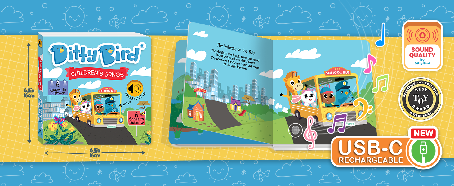 Join Ditty Bird on a delightful musical adventure! Press the sound dot to play six beloved children's songs, teaching your little one about animals, body parts, and the ABCs. Get ready for fun with classics like "The Wheels on the Bus" and "Head, Shoulders, Knees & Toes"!
