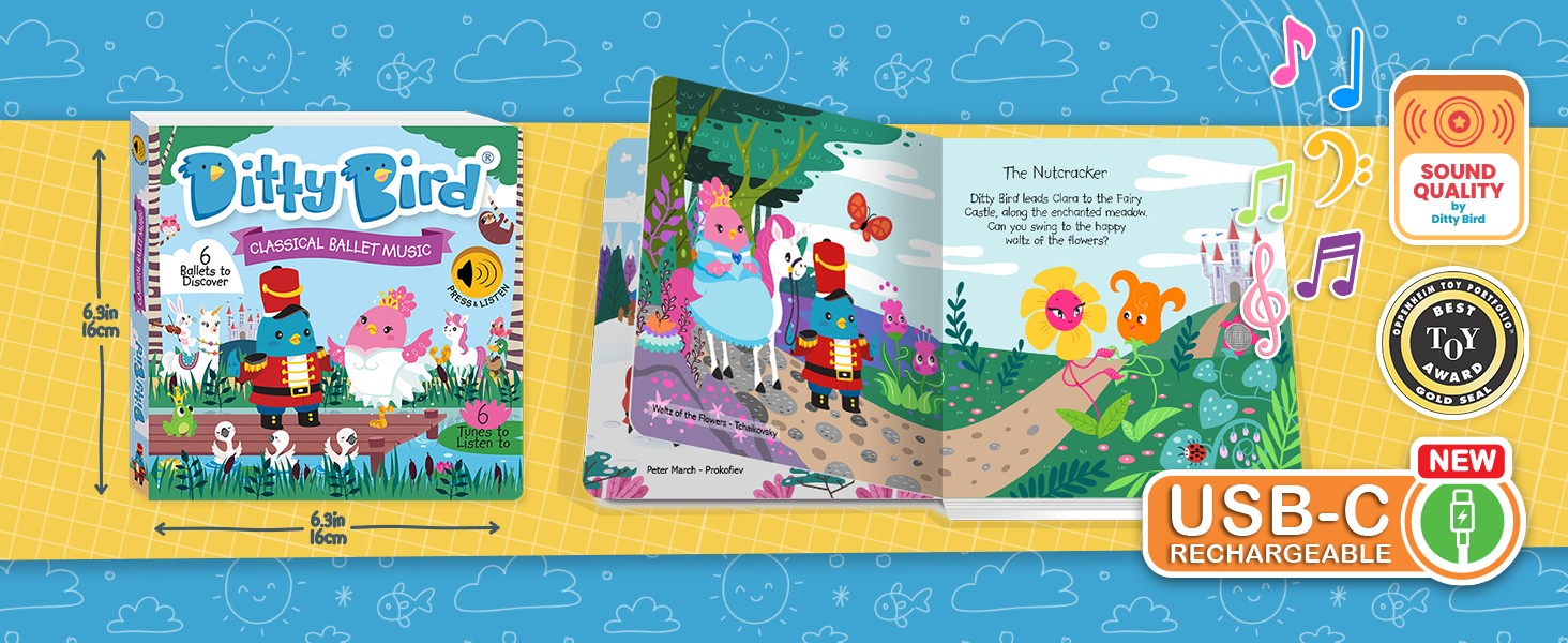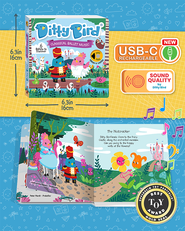 Let the beauty of classical ballet come to life with Ditty Bird’s Classical Ballet music book! With Ditty Bird as their companion, your little one will be captivated by the elegance and charm of ballet masterpieces like Swan Lake and The Nutcracker, sparking their imagination and fostering a love for music and dance.