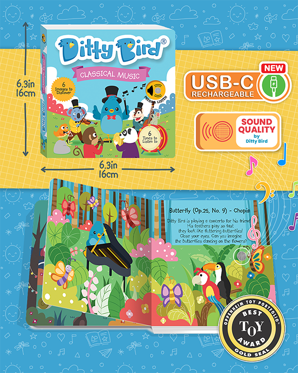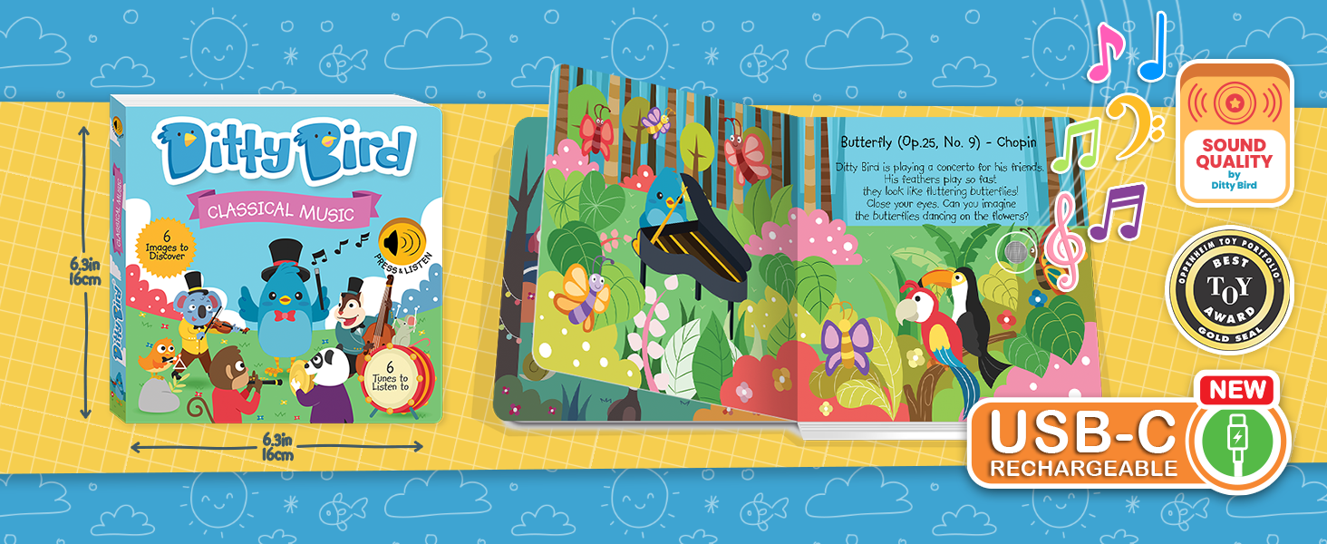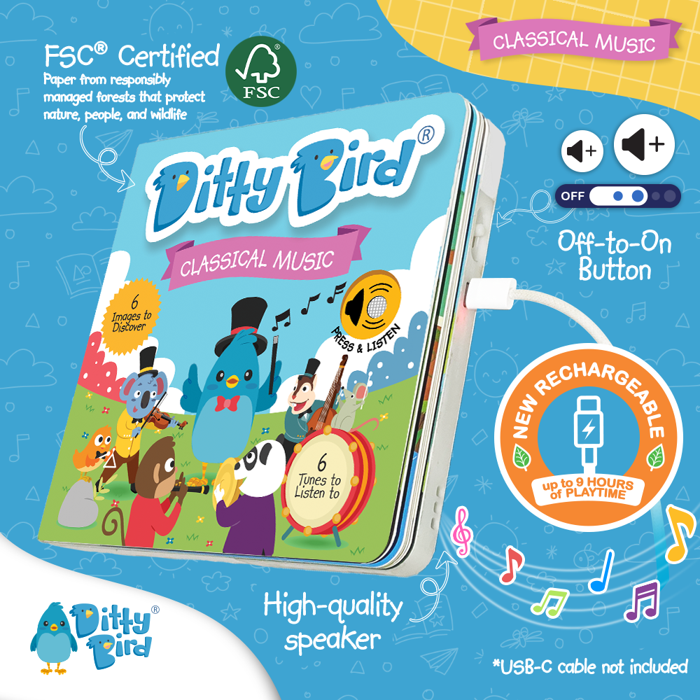 Let Ditty Bird be your guide through the enchanting world of classical compositions with the Classical Music sound book! Featuring iconic works by Beethoven, Mozart, Vivaldi, and Chopin, this book cultivates an early appreciation for music and stimulates cognitive development in young listeners.