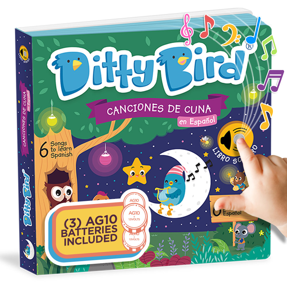 Say buenos noches with Ditty Bird's Canciones de Cuna en Español Sound Book! Featuring 6 classic lullabies such as "Estrellita, ¿dónde estás?" and "Arrorró mi Niño," this book offers a gentle and melodic way to soothe your little ones to sleep while introducing them to the beauty of the Spanish language.