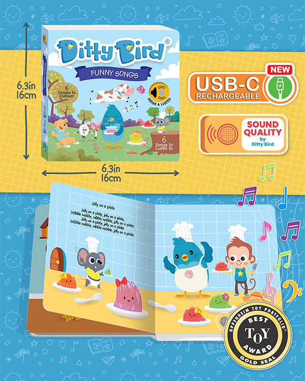 “We love Ditty Bird Books. My son - 1.5 knows how to turn them on and off on his own. He can get an hour (if not more) of entertainment out of these books. Great for when mom or dad need a second. Cute pictures, and great songs. Lyrics included on each page.” - April Smith