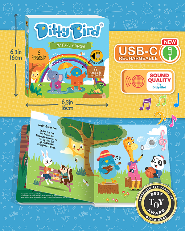 Let the melodies of Ditty Bird’s nature songs sound book transport your child into the heart of nature! With 6 delightful songs covering weather, seasons, and animals, it's the ideal tool for sparking curiosity and teaching valuable lessons about the world around us.