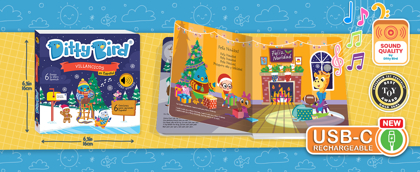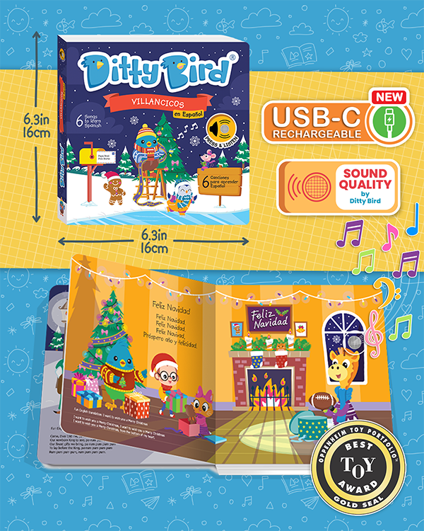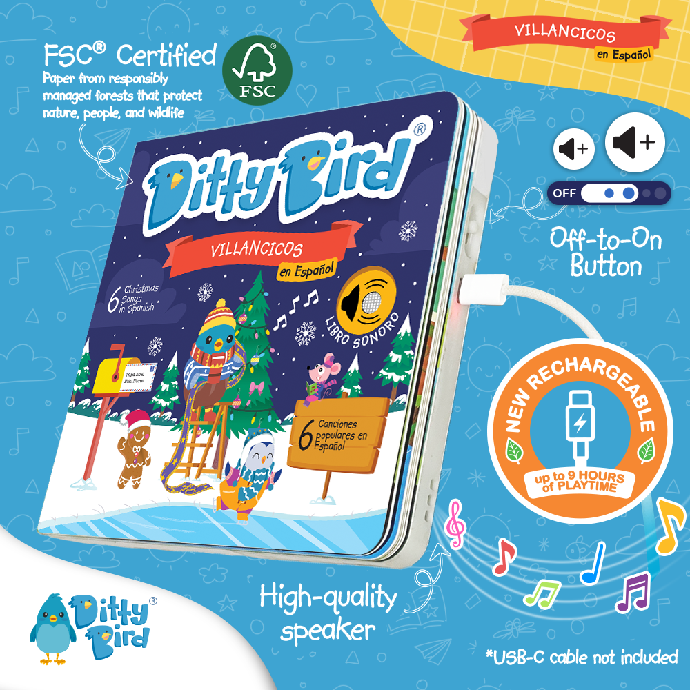 Make the holiday season even merrier with Ditty Bird's Villancicos en Español Sound Book! With 6 timeless Christmas songs like "Feliz Navidad" and "Hoy es Navidad," this book provides a festive and educational experience that helps children learn Spanish in a fun and interactive way.